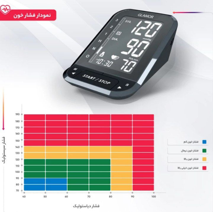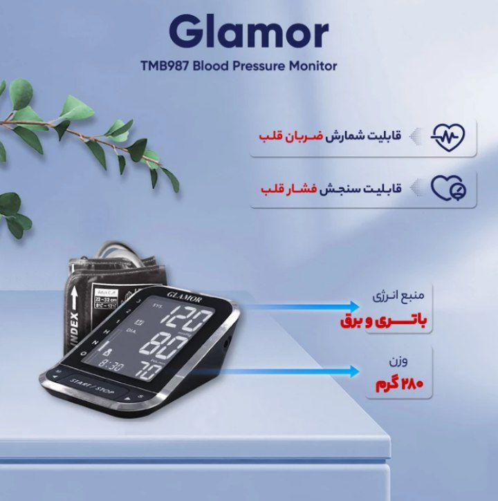 فشار سنج بازویی گلامور Glamor TMB-987 از دقت مناسبی برخوردار است و مناسب بازوهای 22 تا 32 سانتی متر می باشد. نمایشگر WHO بر روی این دستگاه موجود است و می تواند میانگین نتایج سه مورد قبلی را نیز نشان دهد. منبع تغذیه فشار سنج بازویی گلامور Glamor TMB-987 برق و باطری غیرقابل شارژ است. یک آداپتور به همراه کیف ضدضربه و دفترچه راهنمای فارسی بر روی این محصول قرار دارد. این دستگاه مانند اغلب فشارسنج های دیجیتال پس از استفاده به طور خودکار خاموش می شود.حافظه این دستگاه مناسب بوده و دارای 120 جایگاه حافظه برای دو کاربر است. این فشارسنج همچنین قابلیت نمایش میانگین نتایج را دارد و سنجش ضربان قلب را نیز مورد اندازه گیری قرار می دهد. در کنار سنجش ضربان قلب این دستگاه قابلیت تشخیص آریتمی را نیز دارد که برای افرادی که دارای ناراحتی قلبی هستند و یا در سنین بالا به سر می برند گزینه کاربردی به حساب می آید.