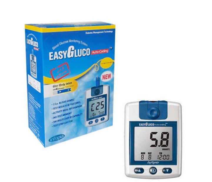 دستگاه تست قند خون «اینفوپیا» (Infopia) مدل «EasyGluco» دارای 365 حافظه، قابلیت تعیین شناسهی شخصی و حالت انجام تست و میانگینگیری از نتایج بوده و برای اندازهگیری قند خون تنها به 1.5 میکرو لیتر خون نیاز دارد. دستگاه دارای چهار حالت انجام تست است که خود شخص آنها را مشخص میکند. این حالتها شامل قبل از خوردن غذا، بعد از خوردن غذا، بعد از استفاده از دارو و بعد از ورزش میشوند. همچنین شخص میتواند قبل از اندازهگیری شناسه خود را وارد کند تا اطلاعات با شناسه خود او داخل حافظهی دستگاه ذخیره شود. حافظهی دستگاه قابلیت ذخیرهی نتایج تا 365 مورد را دارد. با فشردن و رها کردن کلید بالا و پایین دستگاه میتوان حالت انجام تست، تنظیمات زمان و تاریخ و واحد نمایش میزان قند خون و دما را تغییر داد. واحد نمایش قند خون را میتوان بین دو حالت میلیگرم بر دسی لیتر (mg/dl) و میلی مول بر لیتر (mmol/l) تغییر داد. قابلیت جالب این دستگاه محاسبه میانگین نتایج است که میتوان تعداد روزهای اندازهگیری 3 میانگین را از 7 تا 90 روز تعیین کرد. انرژی دستگاه از دو عدد باتری سکهای CR3032 تأمین میشود. این دستگاه دارای قابلیت Auto Coding است و کد نوار تست قند خون را به شکل اتوماتیک از روی نوار تشخیص میدهد؛ بنابراین احتیاجی به واردکردن کد به شکل دستی نیست. مقدار خون موردنیاز برای اندازهگیری قند خون توسط دستگاه 1.5 میکرو لیتر است. پس از قرار دادن قطرهی خون روی محل مشخصشدهی نوار، 9 ثانیه طول میکشد تا قند خون روی صفحه به نمایش در آید. اقلام همراه دستگاه شامل 50 عدد نوار تست، قلم سوزن زن، سوزن، دو عدد باتری سکهاي، همهی اینها داخل یک کیف نگهداری محکم ارائه میشوند. دستگاه EasyGluco دارای یک نرمافزار کنترل دیابت است که میتواند نتیجهی کلیهی تستها را در خود ذخیره کند. برای این منظور باید اطلاعات دستگاه را توسط کابل مخصوص (باید جداگانه تهیه شود) به کامپیوتر شخصی فرستاد. به طور خلاصه تست قند خون Infopia EasyGluco دارای 356 حافظهی ذخیرهسازی، قابلیت تعیین شناسهی شخصی، نمایش نتیجه در 9 ثانیه، تعیین حالت انجام تست، خواندن اتوماتیک کد نوار، قابلیت میانگینگیری از نتایج، اندازهگیری دمای محیط و اقلام همراه کامل بوده و برای اندازهگیری قند خون تنها به 1.5 میکرو لیتر خون نیاز دارد.